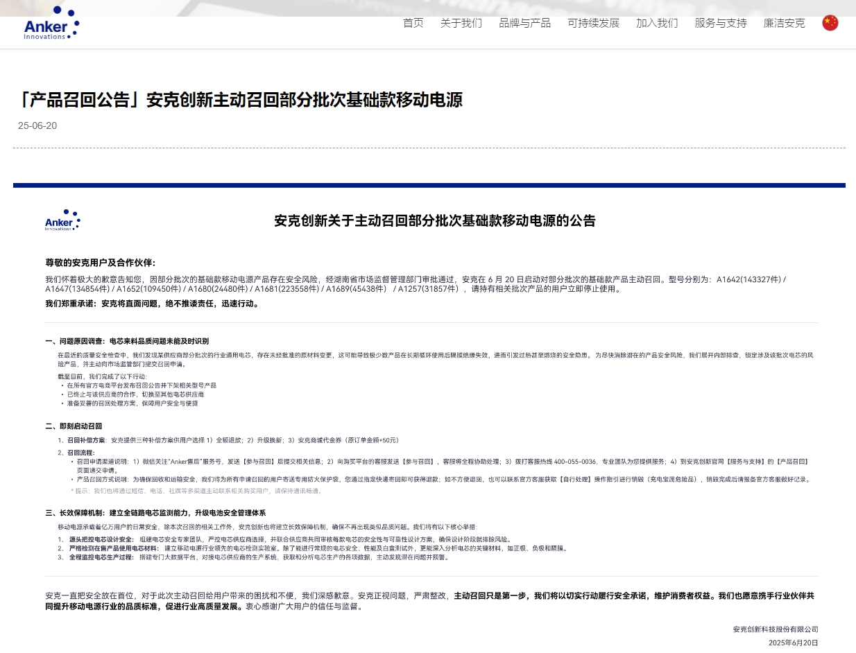 罗马仕后,又有品牌宣布召回移动电源(充电宝),召回原因同样和“电芯”有关。6月20日,安克创新科技股份有限公司(简称“安克创新”,股票代码:300866)在该公司官网发布公告称,因部分批次的基础款移动电源产品存在安全风险,经湖南省市场监督管理部门审批通过,在6月20日启动对部分批次的基础款产品主动召回。但该公司并未就此事通过深交所发布相关公告,引发投资者质疑。